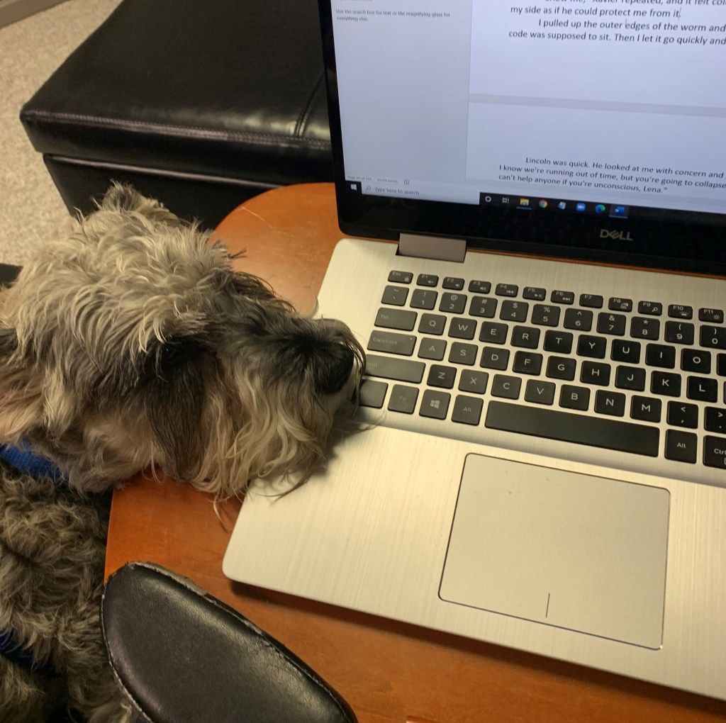 Scooch began his new job by snoring on the nearby guest bed as I typed in the upstairs study at the desk, but once COVID kept the kids at home part-time for remote learning, I needed to be closer to assist them. Now most days I write in the living room in my comfy dark red chair with my legs stretched out on the long ottoman. Or I’m in the family room on the recliner of our brown leather sectional. This makes it convenient to also teach a little math and English-language arts to my youngest when he gets stuck. My canine writing assistant loves this location change because now he gets the use of my shins and feet to sleep on while I type on my lapdesk. Scooch is very put out if I have to get up to get his siblings from school or run errands or do chores or sit side-by-side with the youngest to complete an online activity together.